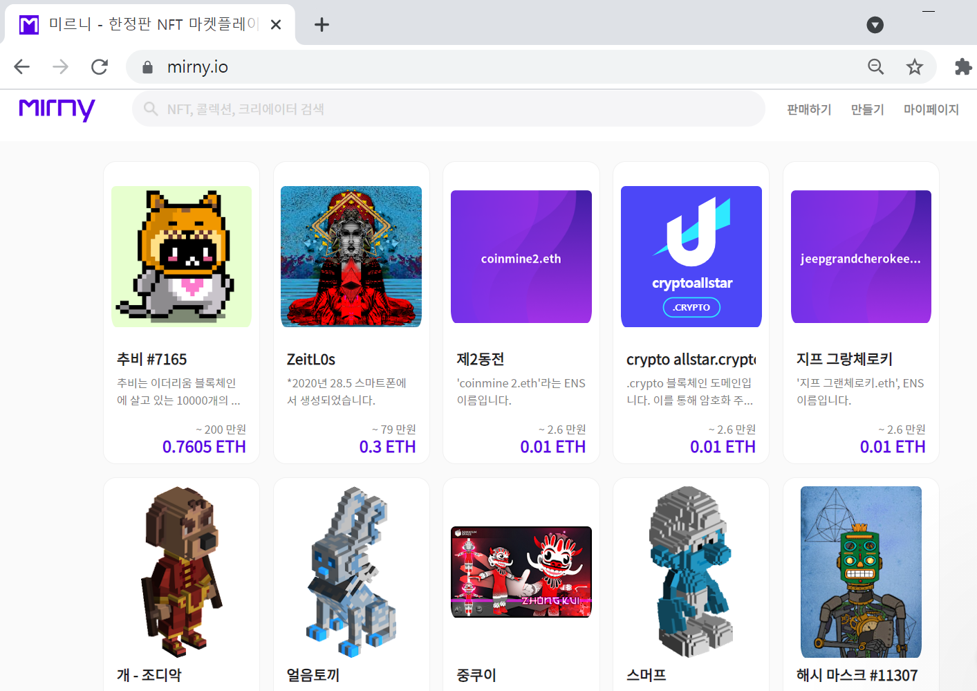 블록체인 암호화폐인 이더리움 기반 대체 불가능 토큰(NFT) 거래소 ‘미르니’가 2021년 7월 27일 서비스를 시작했다.